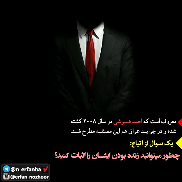 معروف هست که احمدهمبوشی درسال 2008 کشته شده و در جراید عراق هم این مسئله مطرح شد. یک سوال از اتباع احمدهمبوشی: چطور میتوانید زنده بودن ایشان را اثبات کنید؟