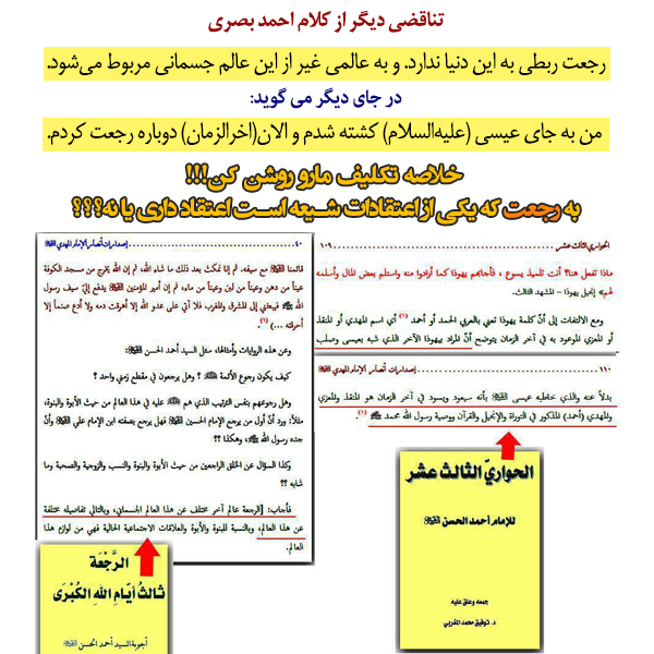 احمدبصری میگوید: رجعت ربطی به این دنیا ندارد. وبه عالمی غیر از این عالم مربوط میشود.(الحواریالثالثعشر، ص109) و در جایی دیگر میگوید: من به جای عیسی(علیهالسلام) کشته شدم والان(آخرالزمان) دوباره رجعت کردم.(الرجعة ثالث ایاماللهالکبری، ص40) خلاصه تکلیف مارو روشن کن!!! به رجعت که از اعتقادات شیعه است، اعتقاد داری یا نه؟؟؟