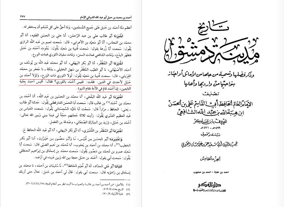 از جمله غلوهای بسیار بزرگ که کذب آن واضح و آشکار است، کلام قتیبة بن سعید است که ابن عساکر در کتاب خود آورده است: «احمد بن حنبل در میان امت اسلامی، مقام نبوت را عهدهدار بود.»«قال سمعت قتيبة بن سعيد يقول لولا الثوري مات الورع ولولا أحمد بن حنبل لأحدث في الدين فقلت تقيس أحمد بالثوري فقال أقيس أحمد بعلية التابعين إنّ أحمد قام في الأمة مقام النبوة.» ابن عساکر، تاریخ مدینه دمشق، دار الفکر، ج5، ص277. لینک مقاله: https://www.adyannet.com/fa/news/28130