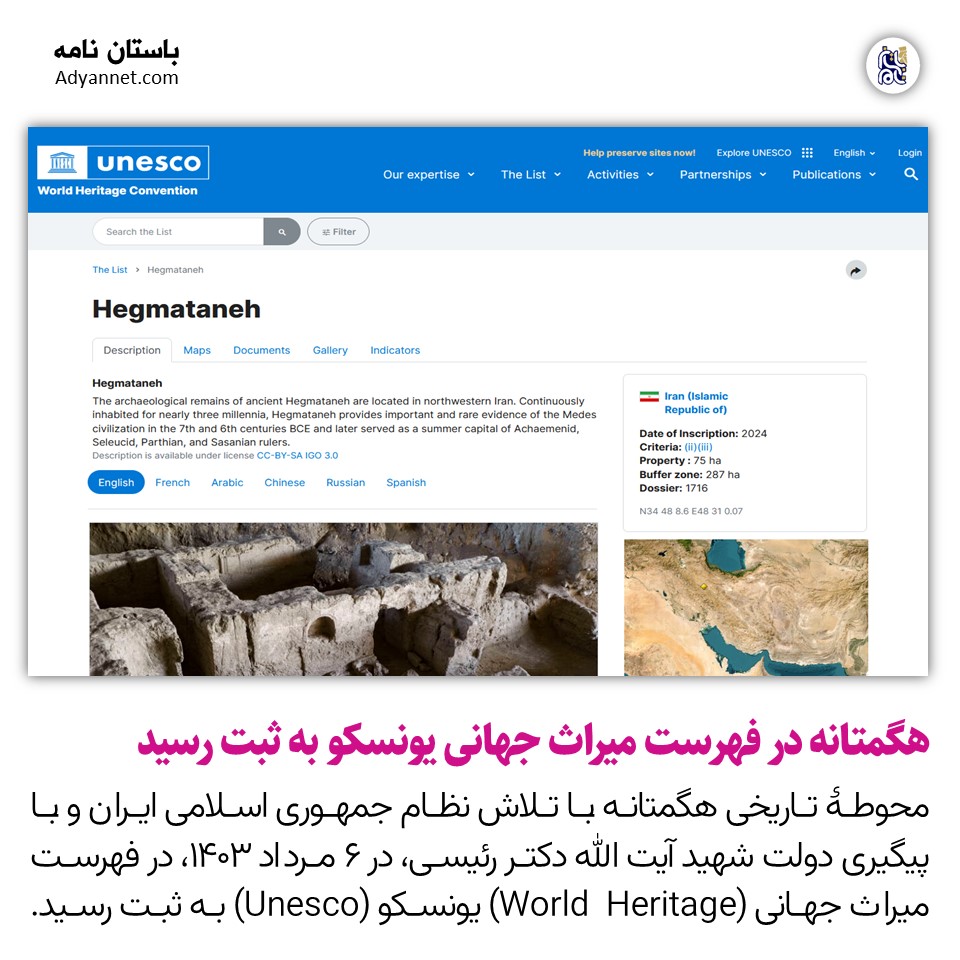 محوطۀ تاریخی هگمتانه با تلاش نظام جمهوری اسلامی ایران و با پیگیری دولت شهید آیت الله دکتر رئیسی، در 6 مرداد 1403، در فهرست میراث جهانی (World Heritage) یونسکو (Unesco) به ثبت رسید.