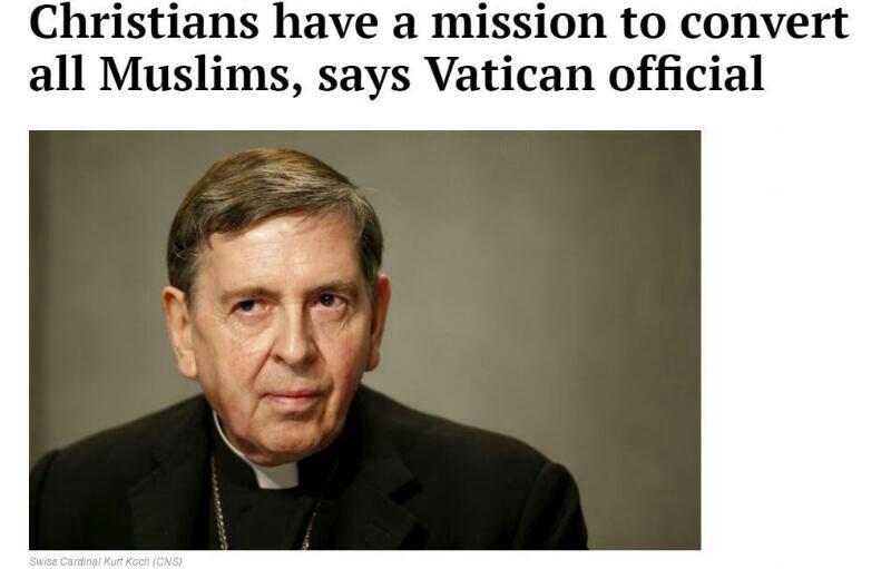 کاردینال کورت کوخ (Kurt Koch) که روابط بینالملل واتیکان را عهدهدار است، در نشست گفتگوهای بین الادیان در کمبریج تأکید کرد: «رسالت واتیکان مسیحی کردن همه مسلمانان است اما ما هیچگاه نباید برای مسیحی نمودن یهودیان تلاش کنیم چون دین یهود، بهمثابه مادری برای مسیحیت است».