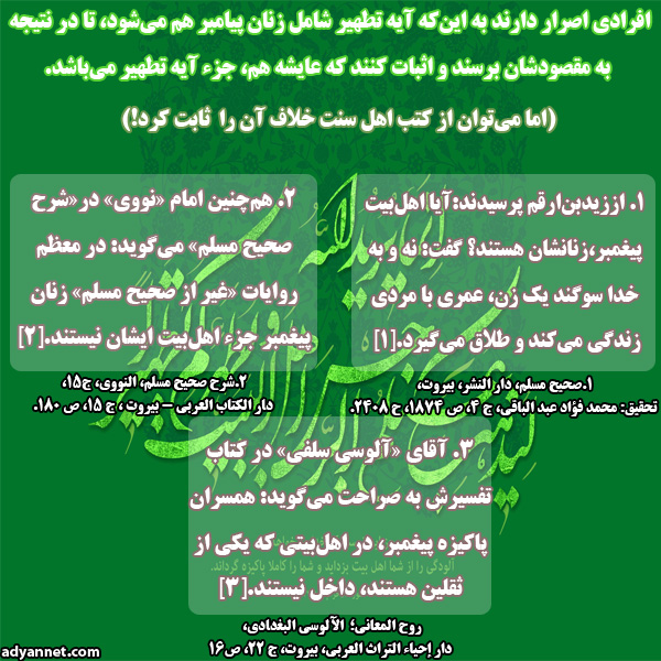 برخی میخواهند با توجه به تفسیر نادرست آیهی تطهیر، این آیه را به نغع خود برای کسان دیگری هم به کار ببرند که خوشبختانه به هیچ وجه این کار امکان ندارد.