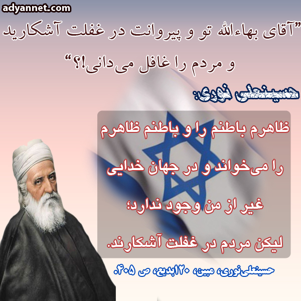 از حسینعلی نوری رهبر فرقهی بهائیت پرسیدند تو که خود را خدا میدانی پس چگونه در برخی از نوشتههایت از خدا استمداد طلبیدهای؟ در پاسخ گفت: ظاهرم باطنم را و باطنم ظاهرم را میخواند، و در جهان غیر از من خدایی نیست و لیکن مردم غاقل اند.