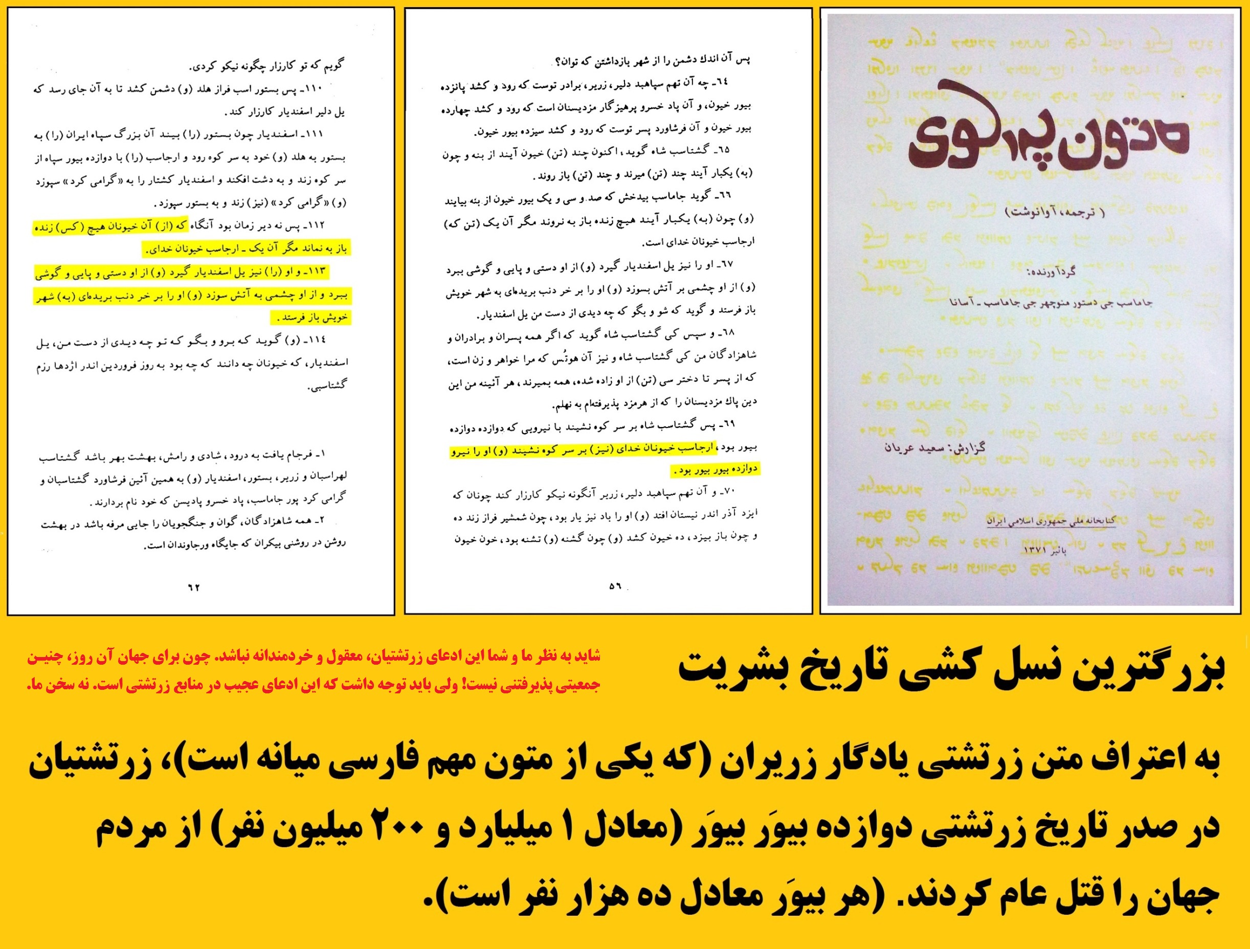 متن پهلوی یادگار زریران -یکی از منابع تاریخی زرتشتی- گویای این است که زرتشتیان در نبرد علیه خیونان، حدود 12 بیوَر بیوَر از مردم غیر زرتشتی معادل 1 میلیارد و 200 میلیون نفر را قتل عام کردند. این اعتراف منابع زرتشتی است. نه منابع غیر زرتشتی!