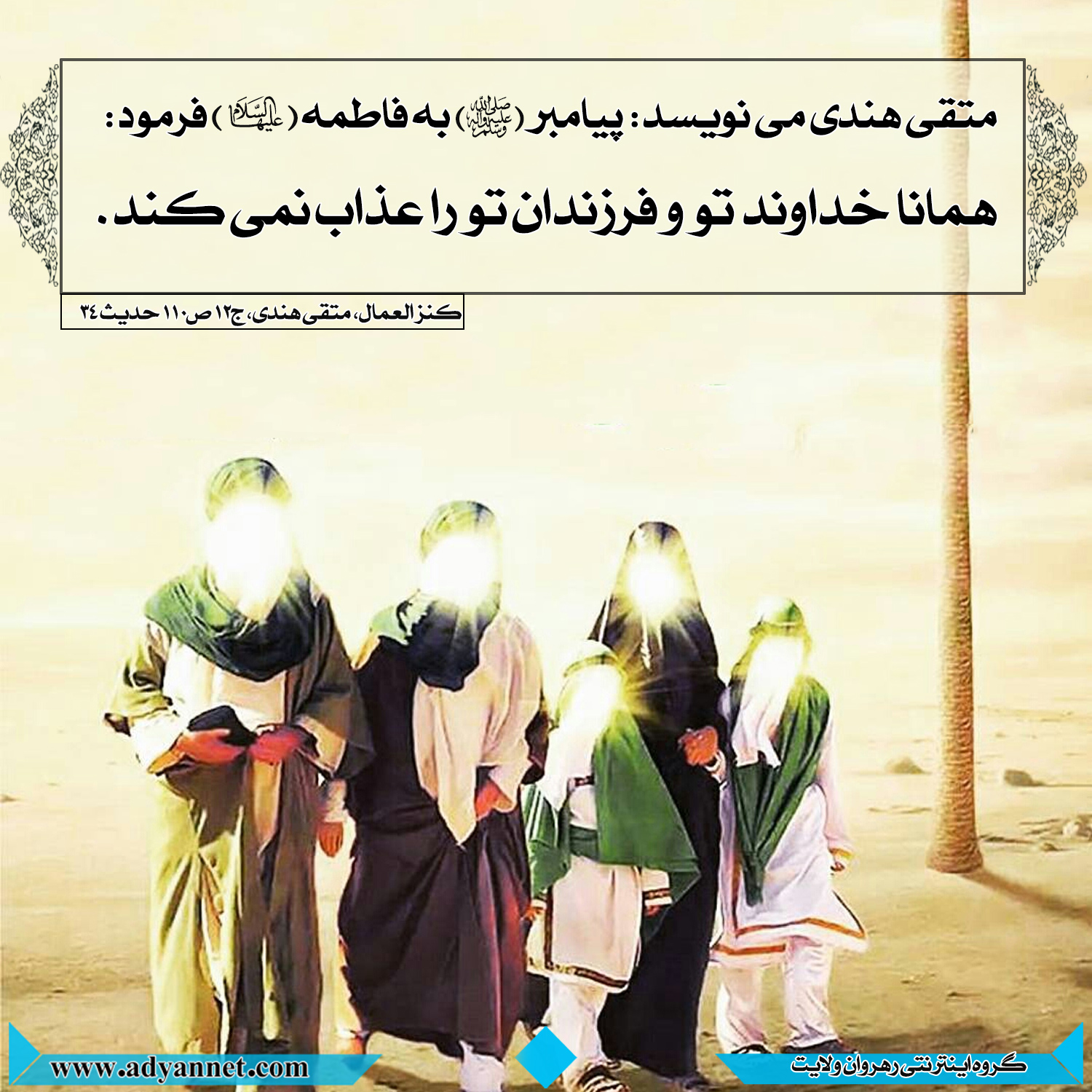متقی هندی مینویسد: پیامبر (صلی الله علیه و آله و سلم) به فاطمه (علیها السلام) فرمود: همانا خداوند تو و فرزندان تو را عذاب نمیکند. کنزالعمال، متقی هندی، ج 12 ص 110 حدیث 34 .
