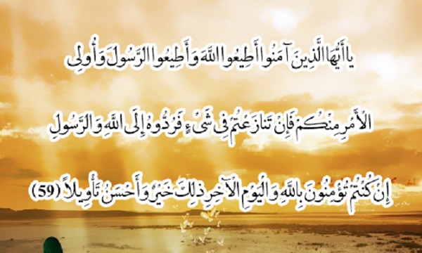 در قرآن، آیاتی دربارهی اطاعت و فرمانبرداری از خدا و رسولان وی، نازلشده است که یکی از این آیات، آیه ۵۹ سورهی نساء است، که اطاعت و فرمانبرداری را فقط مخصوص حقتعالی و رسول اکرم (صلی الله علیه و آله) و ائمهی معصومین (علیهمالسلام) میداند. «یَا أَیُّهَا الَّذِینَ آمَنُوا أَطِیعُوا اللَّهَ وَأَطِیعُوا الرَّسُولَ وَأُولِی الْأَمْرِ مِنْکُمْ... [نساء/59] ای کسانی که ایمان آوردهاید خدا را اطاعت کنید و پیامبر و اولیای امر خود را نیز اطاعت کنید.»