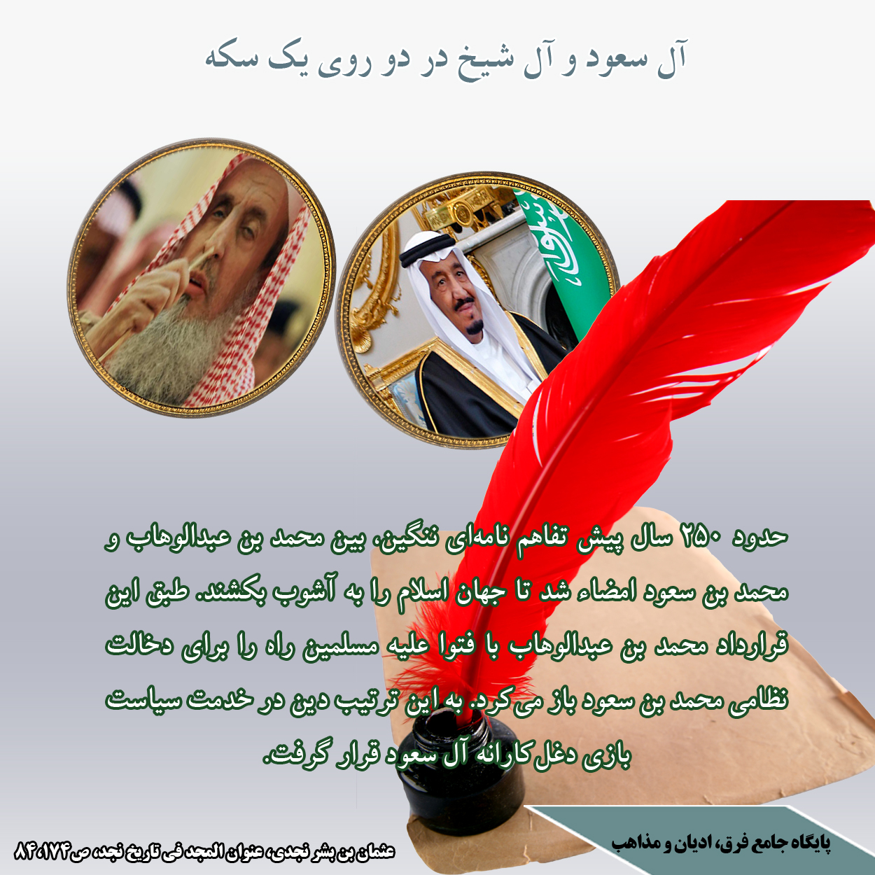 حدود 250 سال پیش تفاهم نامهای ننگین، بین محمد بن عبدالوهاب و محمد بن سعود امضاء شد تا جهان اسلام را به آشوب بکشند. طبق این قرارداد محمد بن عبدالوهاب با فتوا علیه مسلمین راه را برای دخالت نظامی محمد بن سعود باز میکرد. به این ترتیب دین در خدمت سیاستبازی دغلکارانه آل سعود قرار گرفت.
