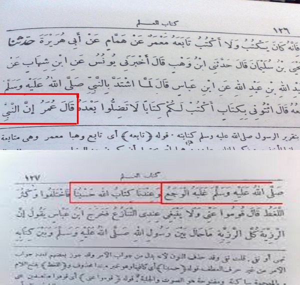 و همچنین مینویسد: عمر بن خطاب گفت رسول خدا به هنگام بیماری فوت، تصمیم گرفت امر خلافت علی (علیهالسلام) را مطرح کند، اما من به خاطر بیم از فتنه و متلاشی شدن امر اسلام مانع آن شدم!!! پس رسول خدا (صلیاللهعلیهوآله) به نیّت قلبی من پیبرد و از انجام تصمیم خود صرفنظر و خودداری کرد.[2]