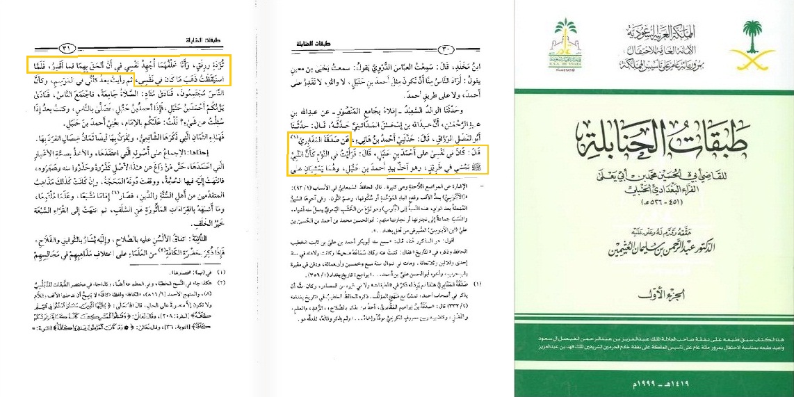 [1]. «عَنْ صدقة المقابري قَالَ كان فِي نفسي عَلَى أحمد بن حنبل قَالَ فرأيت فِي النوم كأَنَّ النَّبِيَّ - صَلَّى اللَّهُ عَلَيْهِ وَسَلَّمَ - يمشي فِي طريق وهو آخذ بيد أحمد بن حنبل وهما يمشيان عَلَى تؤدة ورفق وأنا خلفهما أجهد نفسي فِي أن ألحق بهما فما أقدر فلما استيقظت ذهب ما كان فِي نفسي.» طبقات الحنابله، محمد بن ابی یعلی، ج1، ص31. جهت مشاهده تصویر کلیک کنید.