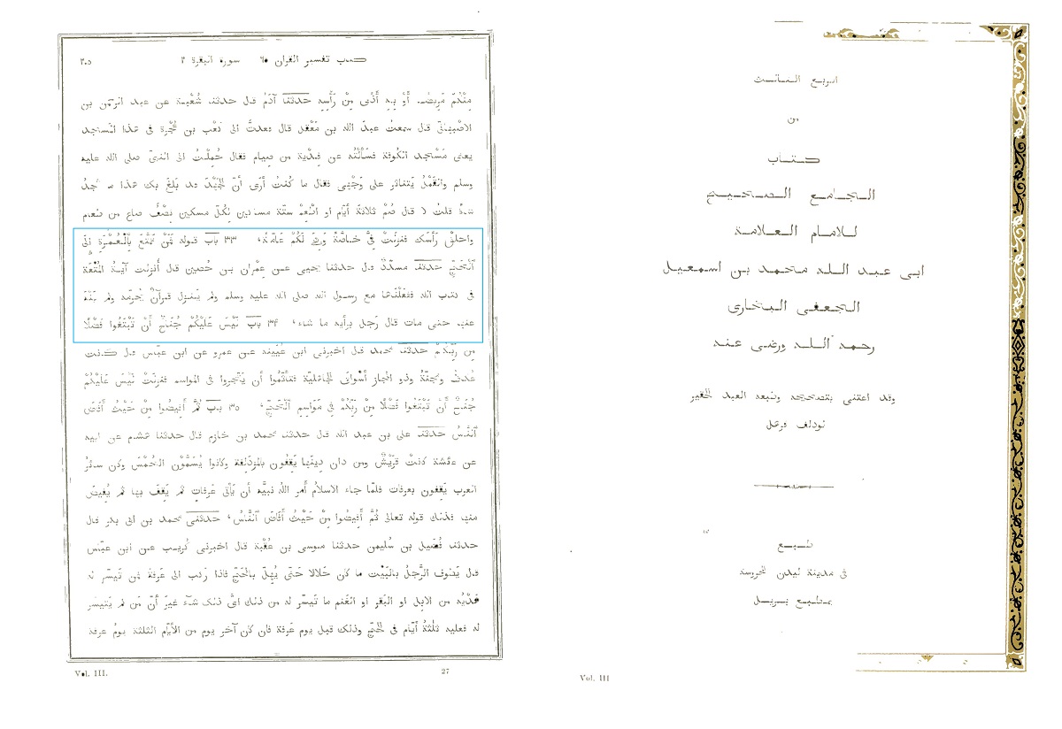 نقل روایت تحریم متعه توسط کتاب صحیح بخاری چاپ بریل: «حَدَّثَنَا مُسَدَّدٌ، حَدَّثَنَا يَحْيَى، عَنْ عِمْرَانَ أَبِي بَكْرٍ، حَدَّثَنَا أَبُو رَجَاءٍ، عَنْ عِمْرَانَ بْنِ حُصَيْنٍ رَضِيَ اللَّهُ عَنْهُمَا، قَالَ: "أُنْزِلَتْ آيَةُ المُتْعَةِ فِي كِتَابِ اللَّهِ، فَفَعَلْنَاهَا مَعَ رَسُولِ اللَّهِ صَلَّى اللهُ عَلَيْهِ وَسَلَّمَ، وَلَمْ يُنْزَلْ قُرْآنٌ يُحَرِّمُهُ، وَلَمْ يَنْهَ عَنْهَا حَتَّى مَاتَ، قَالَ: رَجُلٌ بِرَأْيِهِ مَا شَاءَ".»