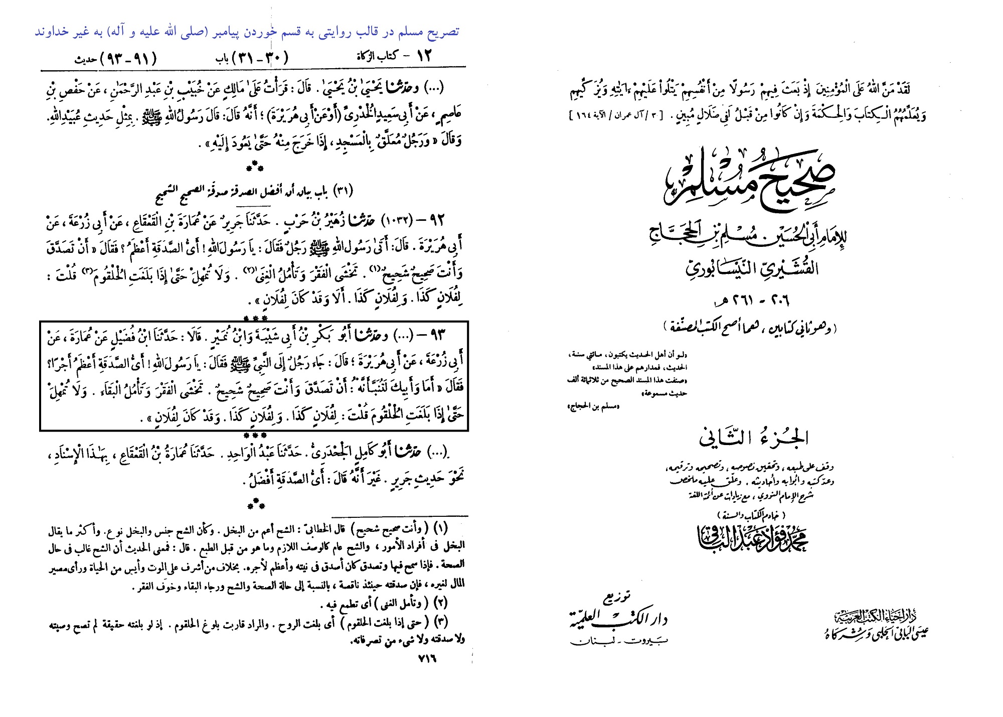 در صحیح مسلم آمده که پیامبر اکرم در جواب سؤال مردی، به جان پدرش قسم خورد: «ابیهریره: قال: جاء رجل الی النبی فقال: یا رسول الله ای الصدقه اعظم اجرا؟ فقال اما و ابیک لننبانه: ان تصدق و انت صحیح...» «ابوهریره میگوید: از پیامبر سوال شد، یا رسول الله! بزرگترین صدقه کدام است؟ پیامبر (صلیاللهعلیهوآله) فرمودند: به جان پدرت، خبر میدهم به شما از آن صدقه. صدقهای که تو میدهی در حالی که سالم هستی...» مسلم بن حجاج نیشابوری، صحیح مسلم، محقق: محمد فواد عبدالباقی، بیروت، انتشارات دار الکتب العلمیه، ج2، ص716.