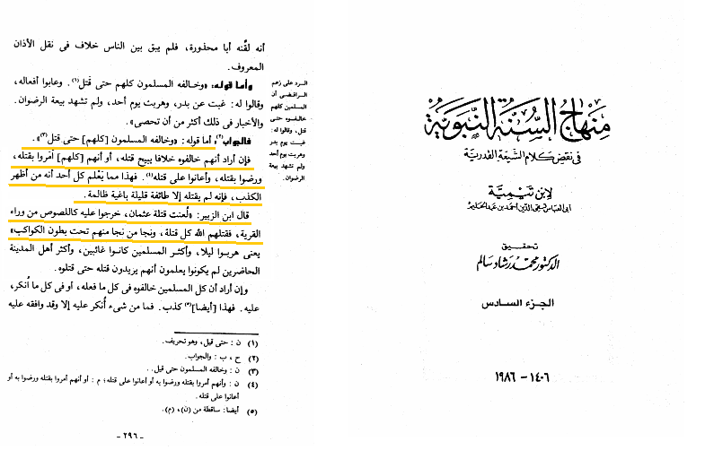 ابنتیمیه، نه تنها با امیرمؤمنان (علیه السّلام) علناً دشمنی میورزد، بلکه از قاتل ایشان نیز دفاعهای سرسختانه میکند؛ چنانکه وی در «منهاج السنة النبویة» مینویسد: «آن که علی (علیه السّلام) را کشت، اهل نماز، روزه و خواندن قرآن بود اعتقاد داشت کشتن علی (علیه السّلام) مورد رضایت خدا و پیامبر (صلی الله علیه و آله و سلم) است و او نیز این کار را برای کسب محبت خدا و رسول انجام میدهد ـ اگر چه او در این عقیده گمراه بود ـ.» این در حالی است که چون سخن از قاتل و یا قاتلان عثمان به میان میآید همو درباره آنان چنین میگوید: «عثمان توسط گروهی اندک که همگی از ظالمان و طاغیان بودند کشته شد و تمام کسانی که در قتل عثمان تلاش نمودند، در اجتهاد خود به خطا رفته، ظالم سرکش و متجاوز به حدود الهی بودند... .» «أَمَّا قَوْلُهُ " وَخَالَفَهُ الْمُسْلِمُونَ [كُلُّهُمْ] حَتَّى قُتِلَ ". فَإِنْ أَرَادَ أَنَّهُمْ خَالَفُوهُ خِلَافًا يُبِيحُ قَتْلَهُ، أَوْ أَنَّهُمْ [كُلَّهُمْ] أَمَرُوا بِقَتْلِهِ، وَرَضُوا بِقَتْلِهِ، وَأَعَانُوا عَلَى قَتْلِهِ. فَهَذَا مِمَّا يَعْلَمُ كُلُّ أَحَدٍ أَنَّهُ مِنْ أَظْهَرِ الْكَذِبِ، فَإِنَّهُ لَمْ يَقْتُلْهُ إِلَّا طَائِفَةٌ قَلِيلَةٌ بَاغِيَةٌ ظَالِمَةٌ. قَالَ ابْنُ الزُّبَيْرِ: " لُعِنَتْ قَتَلَةُ عُثْمَانَ، خَرَجُوا عَلَيْهِ كَاللُّصُوصِ مِنْ وَرَاءِ الْقَرْيَةِ، فَقَتَلَهُمُ اللَّهُ كُلَّ قَتْلَةٍ، وَنَجَا مَنْ نَجَا مِنْهُمْ تَحْتَ بُطُونِ الْكَوَاكِبِ " يَعْنِي هَرَبُوا لَيْلًا، وَأَكْثَرُ الْمُسْلِمِينَ كَانُوا غَائِبِينَ، وَأَكْثَرُ أَهْلِ الْمَدِينَةِ الْحَاضِرِينَ لَمْ يَكُونُوا يَعْلَمُونَ أَنَّهُمْ يُرِيدُونَ قَتْلَهُ حَتَّى قَتَلُوهُ»(منهاج السنة النبویة، ابنتیمیه، مؤسسة قرطبة، مصر، ج 6، ص 296)