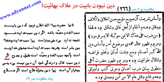 اما این ادعا در حالیست که به تصریح متون بهائی، آیین ساختگی بابیت مروج خشونت و جنگ و خونریزی بوده است؛ همچنان که عبدالبهاء گفته است: «و در یوم ظهور حضرت (باب) منطوق بیان، ضرب اَعناق (زدن گردنها) و حَرق کُتُب و اوراق (سوزاندن کتابها و نوشتهجات) و هدم بقاع (نابودی اماکن) و قتل عام، إلّا مَن آمن و صدق (مگر کسانی که به او ایمان بیاورند و تصدیقش کنند) بود».[2]