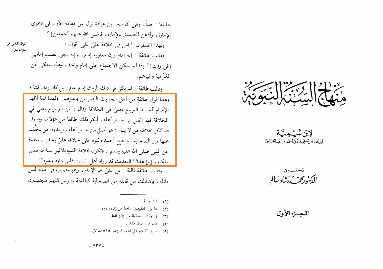 «وَهَذَا قَوْلُ طَائِفَةٍ مِنْ أَهْلِ الْحَدِيثِ الْبَصْرِيِّينَ وَغَيْرِهِمْ. وَلِهَذَا لَمَّا أَظْهَرَ الْإِمَامُ أَحْمَدُ التَّرْبِيعَ بِعَلِيٍّ فِي الْخِلَافَةِ وَقَالَ: مَنْ لَمْ يُرَبِّعْ بِعَلِيٍّ فِي الْخِلَافَةِ فَهُوَ أَضَلُّ مِنْ حِمَارِ أَهْلِهِ، أَنْكَرَ ذَلِكَ طَائِفَةٌ مِنْ هَؤُلَاءِ، وَقَالُوا: قَدْ أَنْكَرَ خِلَافَتَهُ مَنْ لَا يُقَالُ: هُوَ أَضَلُّ مِنْ حِمَارِ أَهْلِهِ، يُرِيدُونَ مَنْ تَخَلَّفَ عَنْهَا مِنَ الصَّحَابَةِ. وَاحْتَجَّ أَحْمَدُ وَغَيْرُهُ عَلَى خِلَافَةِ عَلِيٍّ بِحَدِيثِ سَفِينَةَ عَنِ النَّبِيِّ - صَلَّى اللَّهُ عَلَيْهِ وَسَلَّمَ -: " «تَكُونُ خِلَافَةُ النُّبُوَّةِ ثَلَاثِينَ سَنَةً ثُمَّ تَصِيرُ مُلْكًا» "، وَ هَذَا الْحَدِيثُ قَدْ رَوَاهُ أَهْلُ السُّنَنِ كَأَبِي دَاوُدَ وَغَيْرِهِ»