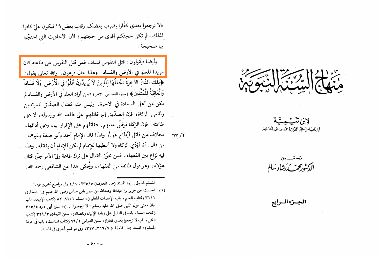 «وَأَيْضًا فَيَقُولُونَ: قَتْلُ النُّفُوسِ فَسَادٌ، فَمَنْ قَتَلَ النُّفُوسَ عَلَى طَاعَتِهِ كَانَ مُرِيدًا لِلْعُلُوِّ فِي الْأَرْضِ وَالْفَسَادِ. وَهَذَا حَالُ فِرْعَوْنَ»