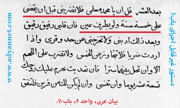 جالب اینجاست که علیمحمد شیرازی این عبارت بینظیر را حدوداً در سنّ 29 سالگی نوشته و به معلّمش دستور داده تا وقتی پنج سالش تمام نشده او را كتک نزند! به عبارتی دیگر علیمحمد شیرازی، در سن 29 سالگی به معلّمش دستوری میدهد كه حدوداً 24 سال قبل قابل اجرا بوده است! اما آيا اندکی عقلانيت در چنین عبارات و یا بهتر بگوییم قلمفرساییهای جناب باب وجود داشته که پیامبرخواندهی بهائی اینگونه از آنان تمجید نموده است؟!