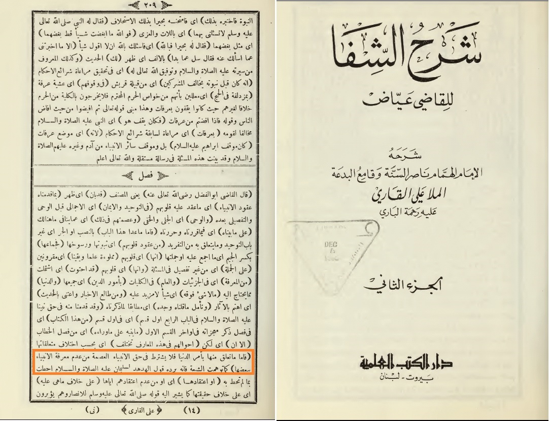 قاضی عیاض، شرح الشفاء، شارح: ملا علی قاری، لبنان، دار الکتب العلمیه، ج 2، ص 209.