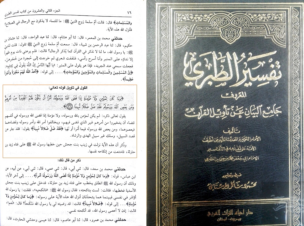 آیه 36 سوره احزاب بر هموزن بودن کلام پیامبر در امور دنیوی با خداوند دارد. طبری ذیل آیه مذکور به داستان زینب و زید در مورد ازدواج اشاره کرده و کلام پیامبر را در جایگاه کلام خداوند میداند. قابل توجه است که امر ازدواج، امری دنیوی و در این آیه اطاعت آن همزون با اطاعت از خداوند قرار داده شده است.
