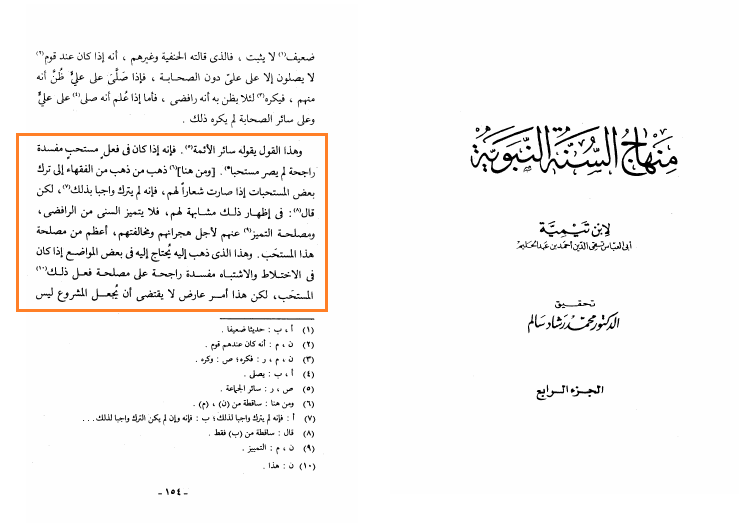 «وَهَذَا الْقَوْلُ يَقُولُهُ سَائِرُ الْأَئِمَّةِ فَإِنَّهُ إِذَا كَانَ فِي فِعْلٍ مُسْتَحَبٍّ مَفْسَدَةٌ رَاجِحَةٌ لَمْ يَصِرْ مُسْتَحَبًّا. [وَمِنْ هُنَا] ذَهَبَ مَنْ ذَهَبَ مِنَ الْفُقَهَاءِ إِلَى تَرْكِ بَعْضِ الْمُسْتَحَبَّاتِ إِذَا صَارَتْ شِعَارًا لَهُمْ، فَإِنَّهُ لَمْ يَتْرُكْ وَاجِبًا بِذَلِكَ، لَكِنْ قَالَ: فِي إِظْهَارِ ذَلِكَ مُشَابَهَةٌ لَهُمْ، فَلَا يَتَمَيَّزُ السُّنِّيُّ مِنَ الرَّافِضِيِّ، وَمَصْلَحَةُ التَّمَيُّزِ عَنْهُمْ لِأَجْلِ هِجْرَانِهِمْ وَمُخَالَفَتِهِمْ، أَعْظَمُ مِنْ مَصْلَحَةِ هَذَا الْمُسْتَحَبِّ. وَهَذَا الَّذِي ذَهَبَ إِلَيْهِ يُحْتَاجُ إِلَيْهِ فِي بَعْضِ الْمَوَاضِعِ إِذَا كَانَ فِي الِاخْتِلَاطِ وَالِاشْتِبَاهِ مَفْسَدَةٌ رَاجِحَةٌ عَلَى مَصْلَحَةِ فِعْلِ ذَلِكَ الْمُسْتَحَبِّ، لَكِنَّ هَذَا أَمْرٌ عَارِضٌ لَا يَقْتَضِي أَنْ يَجْعَلَ الْمَشْرُوعَ لَيْسَ»