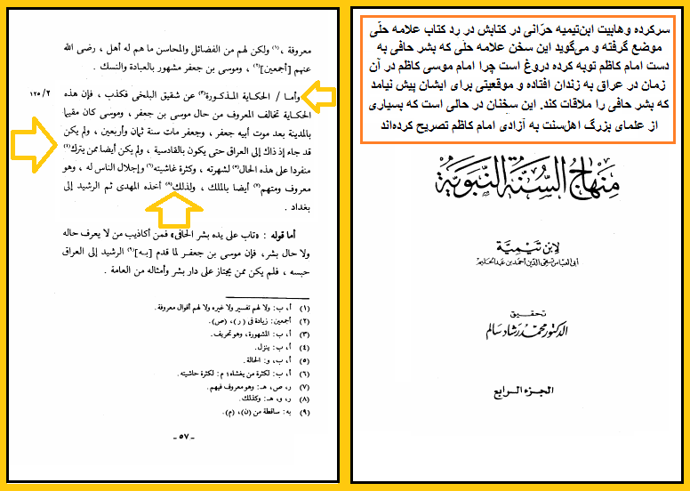 او مىگويد: «اما اين سخن او [یعنی علامه حلى] كه بشر حافى به دست ايشان [یعنی امام كاظم] توبه كرده، دروغ كسى است كه نه از موسى بن جعفر و نه از بشر اطلاعات درستى ندارد، زيرا وقتى هارون الرشيد، موسى بن جعفر را به عراق آورد، او را زندانى كرد. بنابراين براى او موقعيتى پيش نيامد تا از كنار خانه بشر و ديگران عبور كند.»