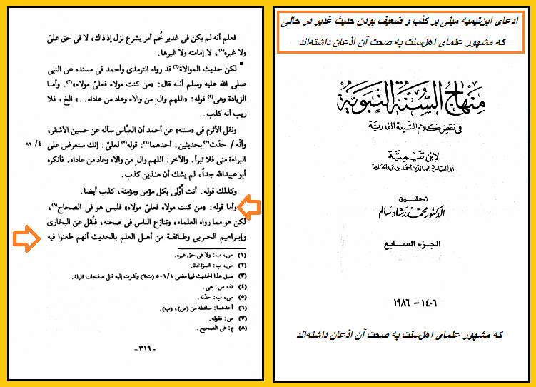 «اگر چه حدیث موالات «من كنت مولاه فعلی مولاه» را ترمذی و احمد بن حنبل نقل کردهاند. ولی این جمله در صحاح نیامده است. به همین جهت مردم در صحت آن اختلاف کردهاند. خصوصاً آنکه اشخاصی مثل بخاری، ابراهیم حربی و طائفهای از اهل علم در این حدیث طعن وارد کردهاند و ثقات آن را نقل نکرده، بلکه آن را ضعیف شمردهاند.»
