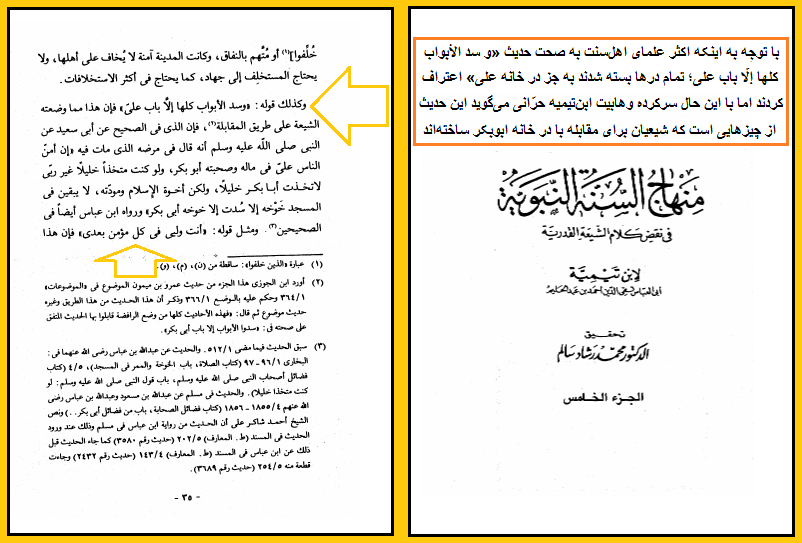 ابن تیمیه الحرانی الحنبلی، منهاج السنة النبویة، ج ۵، ص ۳۵، تحقیق: د. محمد رشاد سالم، ناشر: مؤسسة قرطبة، الطبعة: الأولی، ۱۴۰۶