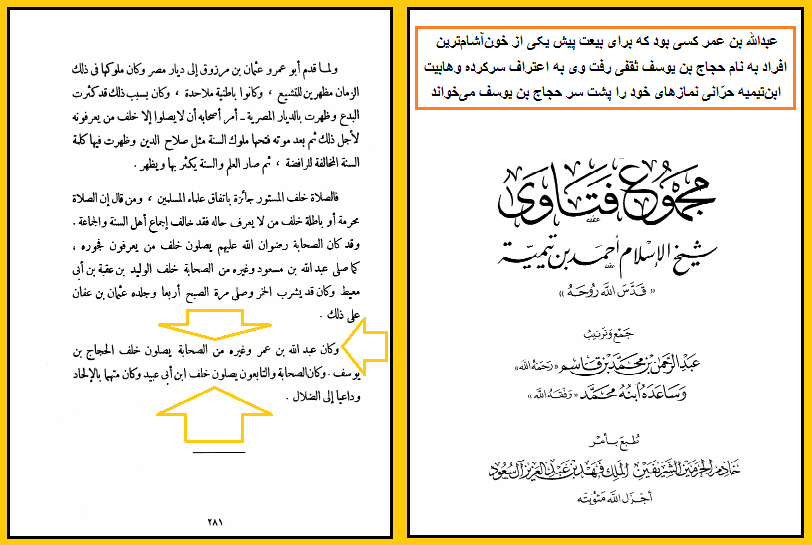 «وَكَانَ عَبْدُ اللَّهِ بْنُ عُمَرَ وَغَيْرُهُ مِنْ الصَّحَابَةِ يُصَلُّونَ خَلْفَ الْحَجَّاجِ بْنِ يُوسُفَ»