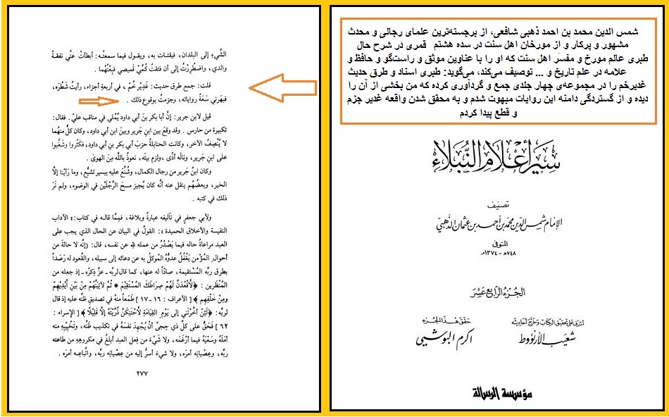ذهبی شافعی، از برجستهترین علمای رجالی و محدث مشهور و پرکار و از مورخان اهل سنت در سده هشتم قمری (متوفای ۷۴۸ قمری) در شرح حال طبری عالم مورخ و مفسر اهل سنت که او را با عناوین موثق و راستگو و حافظ و علامه در علم تاریخ و ... توصیف میکند، میگوید: طبری اسناد و طرق حديث غديرخم را در مجموعهی چهار جلدی جمع و گردآوری کرده که من بخشی از آن را ديده و از گستردگی دامنه اين روايات مبهوت شدم و به محقق شدن واقعه غدير جزم و قطع پيدا کردم.