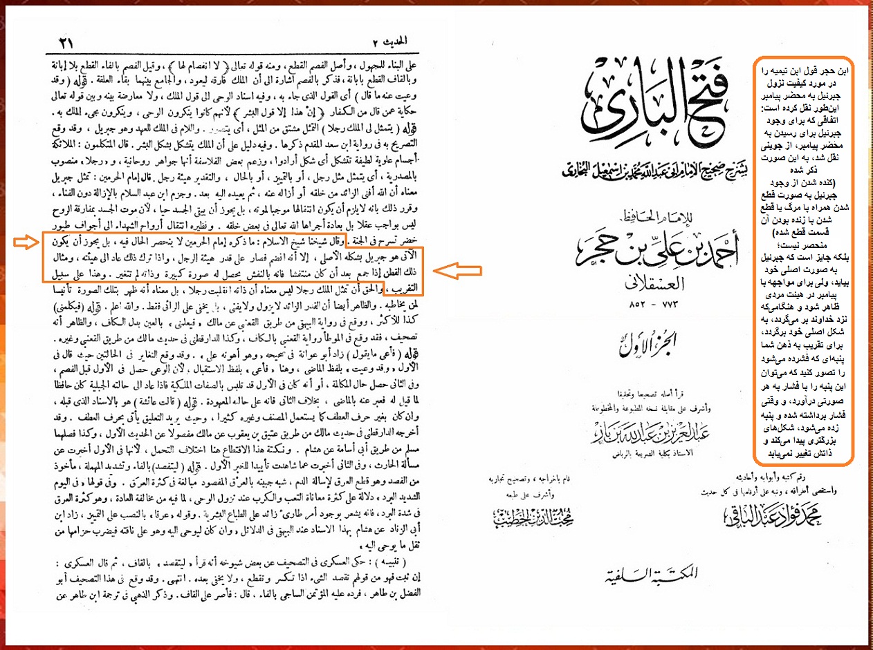 ابن حجر قول ابن تیمیه را در مورد کیفیت نزول جبرئیل به محضر پیامبر اینطور نقل کرده است: اتفاقی که برای وجود جبرئیل برای رسیدن به محضر پیامبر، از جوینی نقل شد، به این صورت ذکر شده (کنده شدن از وجود جبرئیل به صورت قطع شدن همراه با مرگ یا قطع شدن با زنده بودن آن قسمت قطع شده) منحصر نیست؛ بلکه جایز است که جبرئیل به صورت اصلی خود بیاید، ولی برای مواجهه با پیامبر در هیئت مردی ظاهر شود و هنگامیکه نزد خداوند بر میگردد، به شکل اصلی خود برگردد، برای تقریب به ذهن شما پنبهای که فشرده میشود را تصور کنید که میتوان این پنبه را با فشار به هر صورتی درآورد، و وقتی فشار برداشته شده و پنبه زده میشود، شکلهای بزرگتری پیدا میکند و ذاتش تغییر نمییابد.