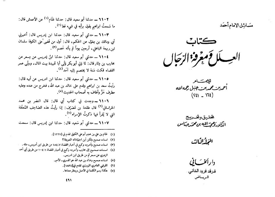 [1]. «حدثنی ابوسعید قال... لمّا ولّی ابوبکر ولّی اباعبیده بیت المال و ولّی عمر بن خطاب القضاء...» العلل و معرفه الرجال، احمد بن حنبل، المکتب الاسلامی، بیروت، لبنان، ج3 ص491 حدیث6104. جهت مشاهده تصویر کتاب کلیک کنید.