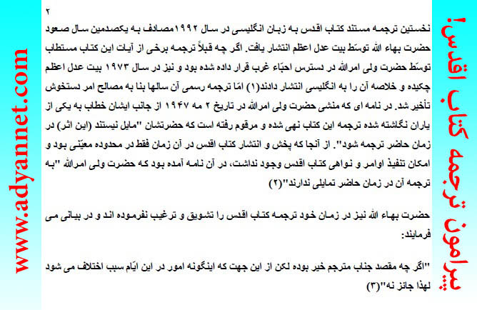 مبلّغ بهائی: به دلیل اینکه بهاءالله در زمان حیاتشان، ترجمهی کتاب اقدس را موجب ایجاد اختلاف دانستهاند: «اگرچه مقصد جناب مترجم خیر بوده لکن از این جهت که اینگونه امور در این ایام سبب اختلاف میشود لهذا جائز نه».[2] همچنین ولیامر ما نیز اساساً ترجمهی کتاب اقدس به زبان فارسی را ممنوع برشمرده و بهائیان ایران را به یادگیری زبان عربی حواله دادهاند: «ترجمه آثار عربیّه به لغت نورا (فارسی) ممدوح و مقبول نه. علیالخصوص احکام کتاب اقدس...».[3]