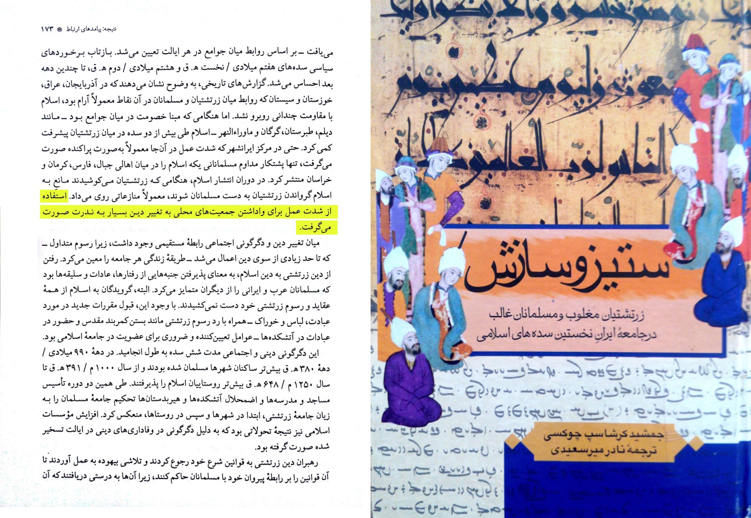 آیا ایرانیان به زور شمشیر مسلمان شدند؟ پاسخ دکتر جمشید کرشاسب چوکسی، پژوهشگر زرتشتی و استاد دانشگاه ایندیانای امریکا: استفاده از شدت عمل (زور و اجبار) به ندرت رخ می‌داد. (بیشتر ایرانیان از روی اختیار مسلمان شدند)