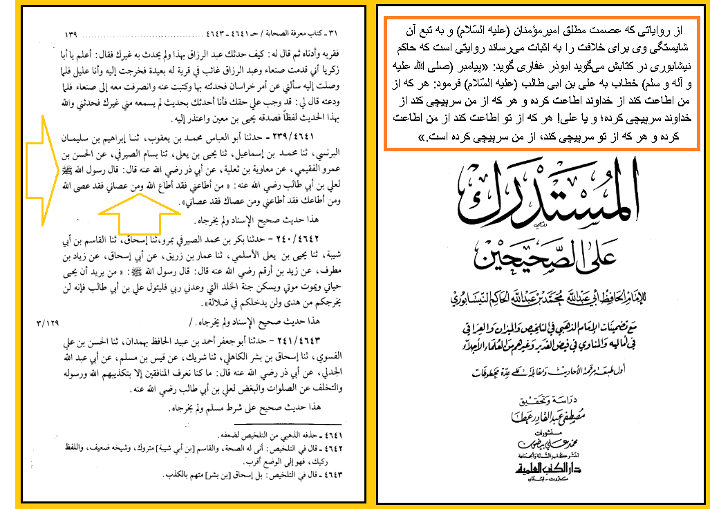 (المستدرک علی الصحیحین، حاکم نیشابوری، دار الکتب العلمیة، بیروت، ج 3، ص 139)