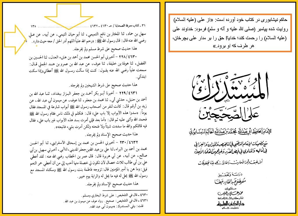 (حاکم نیشابوری، المستدرک علی الصحیحین، تحقیق: عبدالقادر عطا، دار الکتب العلمیه، بیروت 1411، ج3، ص134، ح4629)