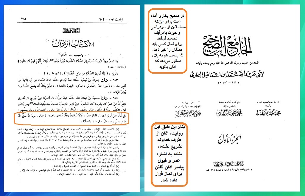 در صحیح بخاری آمده است برای این‌که مسلمانان از سردرگمی و حیرت به‌درآیند، لذا تصمیم گرفتند برای نماز کسی باید همگان را خبر دهد، لذا پیامبر هم به بلال دستور می‌دهد که هر چه را که عبدالله بن زید و عمر بن خطاب در خواب آن را دیده‌اند را از ایشان بشنود و در اذان بگوید:
