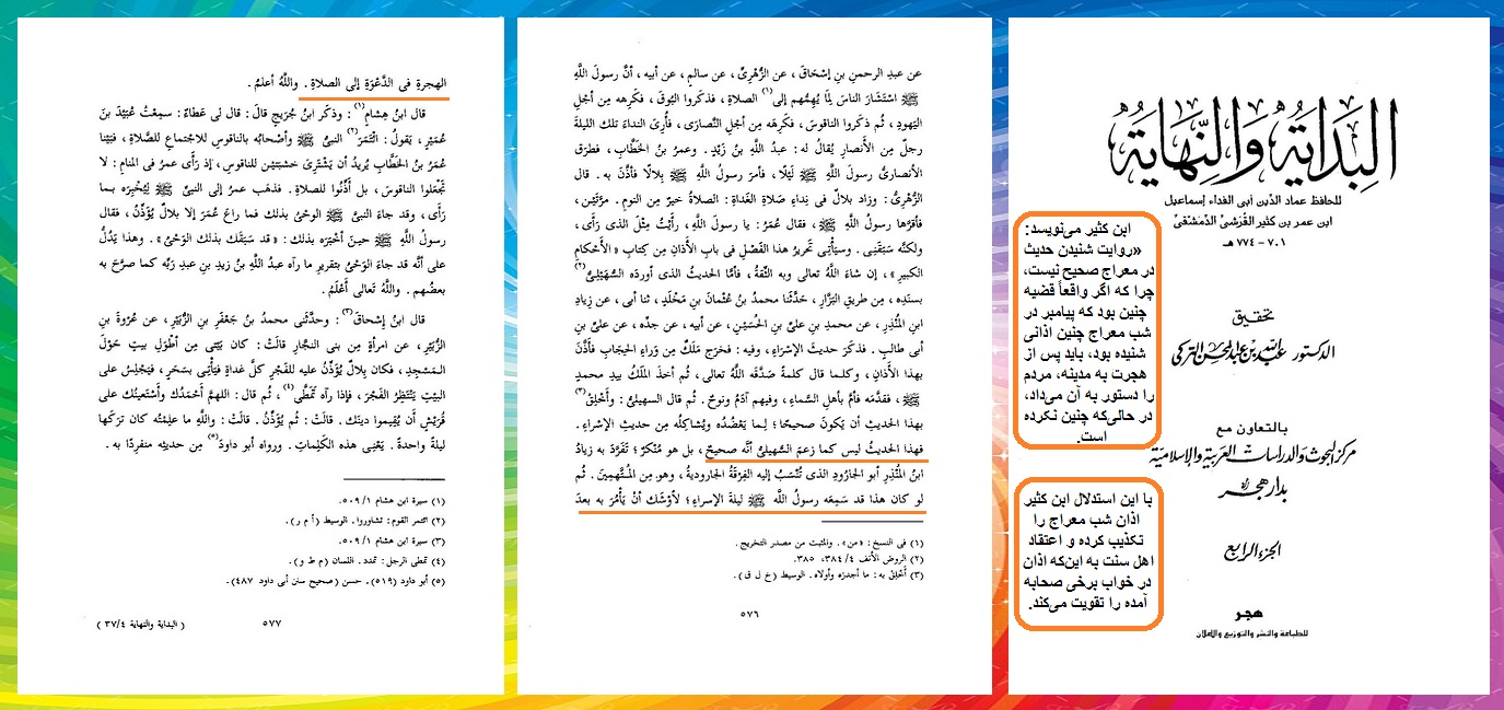 با این استدلال ابن کثیر اذان شب معراج را تکذیب کرده و اعتقاد اهل سنت به این‌که اذان در خواب برخی صحابه آمده را تقویت می‌کند.