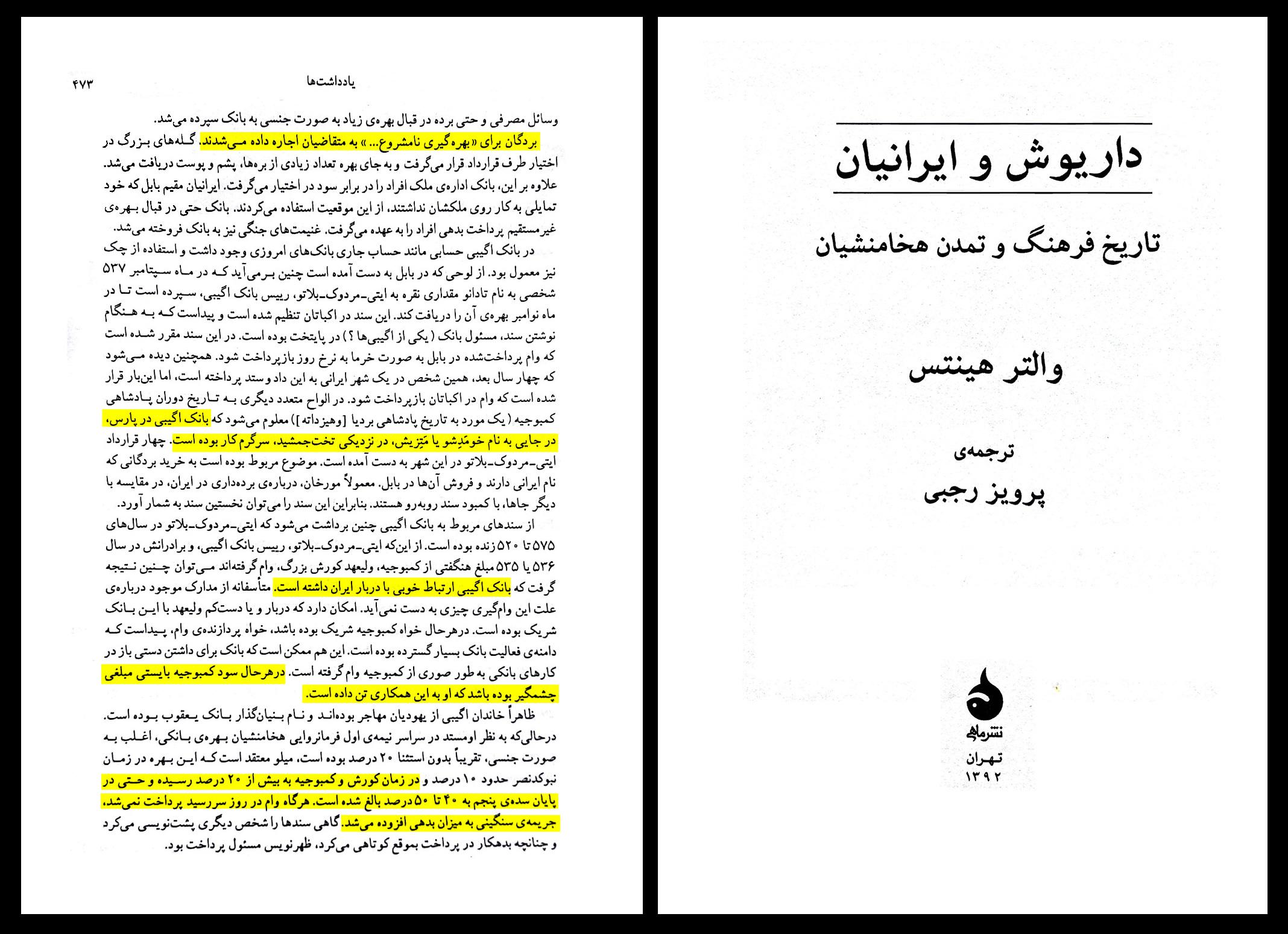 (والتر هینتس، داریوش و ایرانیان، ترجمه پرویز رجبی، تهران: نشر ماهی، 1392، ص 473)