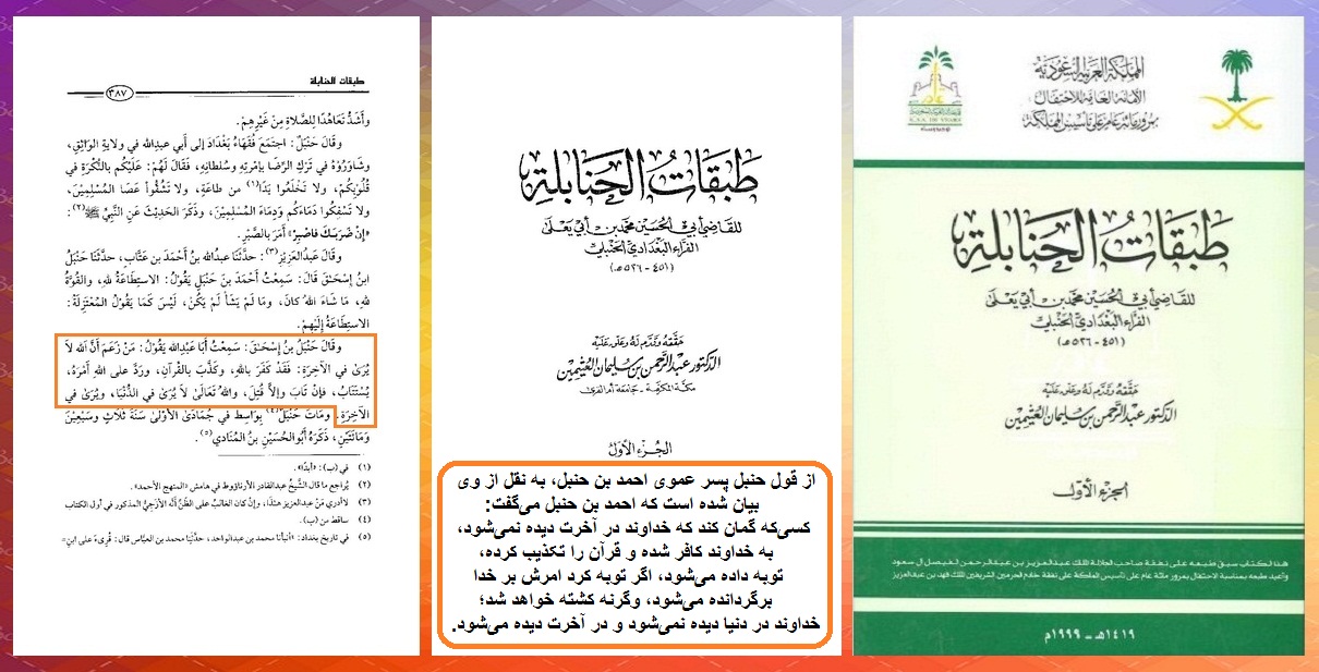 در کتاب طبقات الحنابله، از قول حنبل پسر عموی احمد بن حنبل، به نقل از وی بیان شده است که احمد بن حنبل میگفت: کسیکه گمان کند که خداوند در آخرت دیده نمیشود، به خداوند کافر شده و قرآن را تکذیب کرده، توبه داده میشود، اگر توبه کرد امرش بر خدا برگردانده میشود، وگرنه کشته خواهد شد؛ خداوند در دنیا دیده نمیشود و در آخرت دیده میشود.