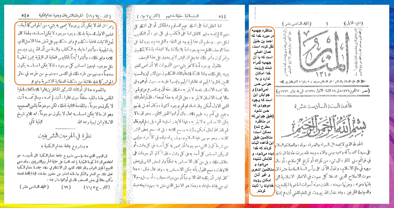 رشیدرضا در مجله المنار میگوید: مناظره جهمیه در مورد خدا که احمد بن حنبل نقل کرده است همان اصلی است که با آن جهمیه گمراه شدند که رؤیت خدا امکان ندارد و به حواس حس نمیشود و جوابش این است که وجود موجودی که حس نشود (طبق جوابی که در مناظره مطرح شد) ممکن است؛ متکلمین طبق این قاعده اثبات کردند که خدا دیده میشود، و کلامش شنیده میشود و متکلمین اشعری و غیر آنان امکان رؤیت خداوند را ثابت کردند.