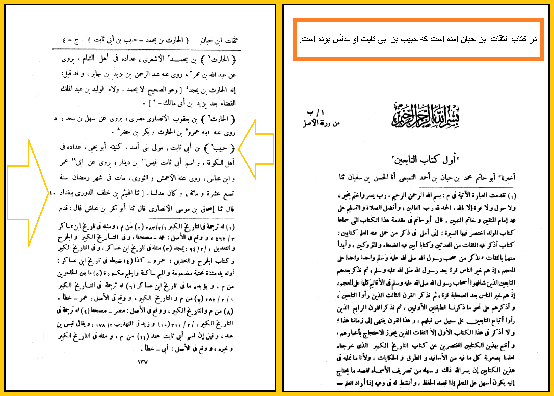 در کتاب الثقات ابن حبان آمده است که وی میگوید حبیب بن ابی ثابت مدلّس بوده است.«حبیب بن أبی ثابت مدلس»(الثقات، ابن حبّان، دارالفکر، بیروت، لبنان، ج4 ص137)مقاله: «این سه آیه از مهمترین دلائل اهل سنت بر بیایمانی ابوطالب»