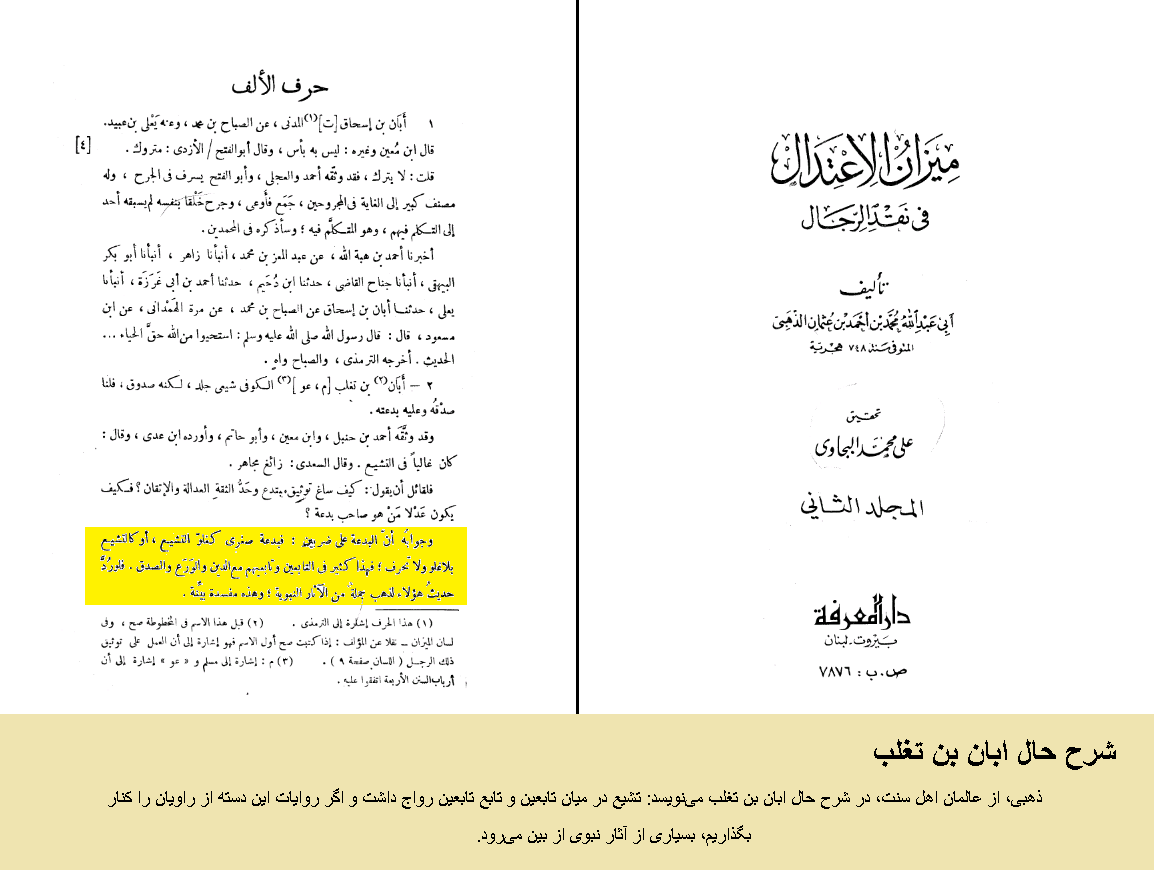 ذهبی، از عالمان اهل سنت، در شرح حال ابان بن تغلب مینویسد: تشیع در میان تابعین و تابع تابعین رواج داشت و اگر روایات این دسته از راویان را کنار بگذاریم، بسیاری از آثار نبوی از بین میرود.