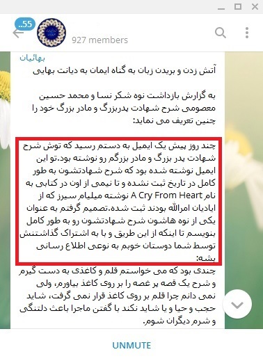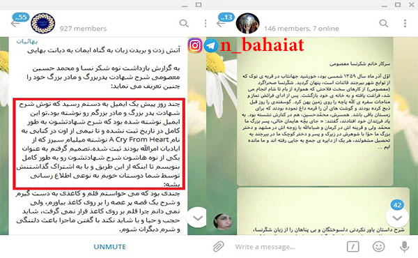 اول: با بررسی شبکههای مجازی تبلیغی بهائیت، به نقل دو گزارش از ماجرای قتل این دو بهائی برخورد میکنیم؛ دو گزارشی که اختلافات فاحشی در آنها وجود دارد. اما با صرفنظر از این تناقضگوییها، از منبع دریافت گزارش دوم نمیتوان گذشت؛ چرا که کانال تبلیغی بهائیت مدعی شده پس از گذر سالیان مدید از این واقعه، نوهی این زوج بهائی پیدا شده و شرح ماوقع را به طور سوزناکتری با ارسال یک ایمیل ناشناس ذکر کرده است! اما مگر آن ایادی امری که این ماجرا را نقل کرده، از غیرخانوادهی زوج مقتول این جزئیات را شنیده بود که اینک بعد از سالها، نوهی آنها پیدا شود تا رُمانی دردناکتر بنویسد و بر مظلومیت بهائیان بیافزاید؟! آری؛ گویا تشکیلات بهائیت به اثرگذاری داستانسرایی اول خود پی برده که در مرتبهی دوم با لحنی دردناکتر، آن را بازسازی کرده است.