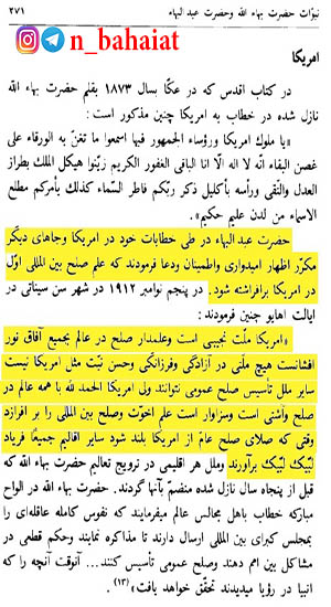 دومین پیشوای بهائیت همچنین وعده داده است: «اما دولت و ملّت آمریکا مسلّم است که نه خیال مستعمراتی دارند نه در فکر توسیع دائره مملکت هستند و نه درصدد حمله به سائر ملل و ممالک».[2]