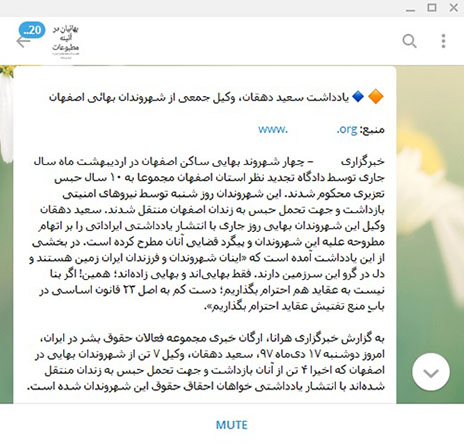 [1]. به نقل از کانالهای خبری وابسته به تشکیلات بهائیت.