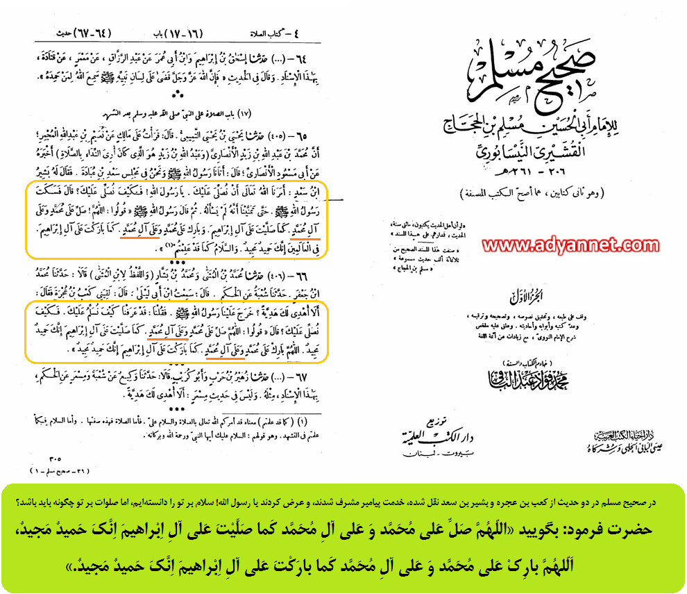 در صحیح مسلم در دو حدیث از کعب بن عجره و بشیر بن سعد نقل شده، خدمت پیامبر مشرف شدند، و عرض کردند یا رسول الله! سلام بر تو را دانستهایم، اما صلوات بر تو چگونه باید باشد؟ حضرت فرمود: بگویید «اللّهُمَّ صَلِّ عَلى مُحَمَّد وَ عَلى آلِ مُحَمَّد کَما صَلَّیْتَ عَلى آلِ اِبْراهیمَ اِنَّکَ حَمیدٌ مَجیدٌ، اَلّلهُمَّ بارِکْ عَلى مُحَمَّد وَ عَلى آلِ مُحَمَّد کَما بارَکْتَ عَلى آلِ اِبْراهیمَ اِنَّکَ حَمیدٌ مَجیدٌ»