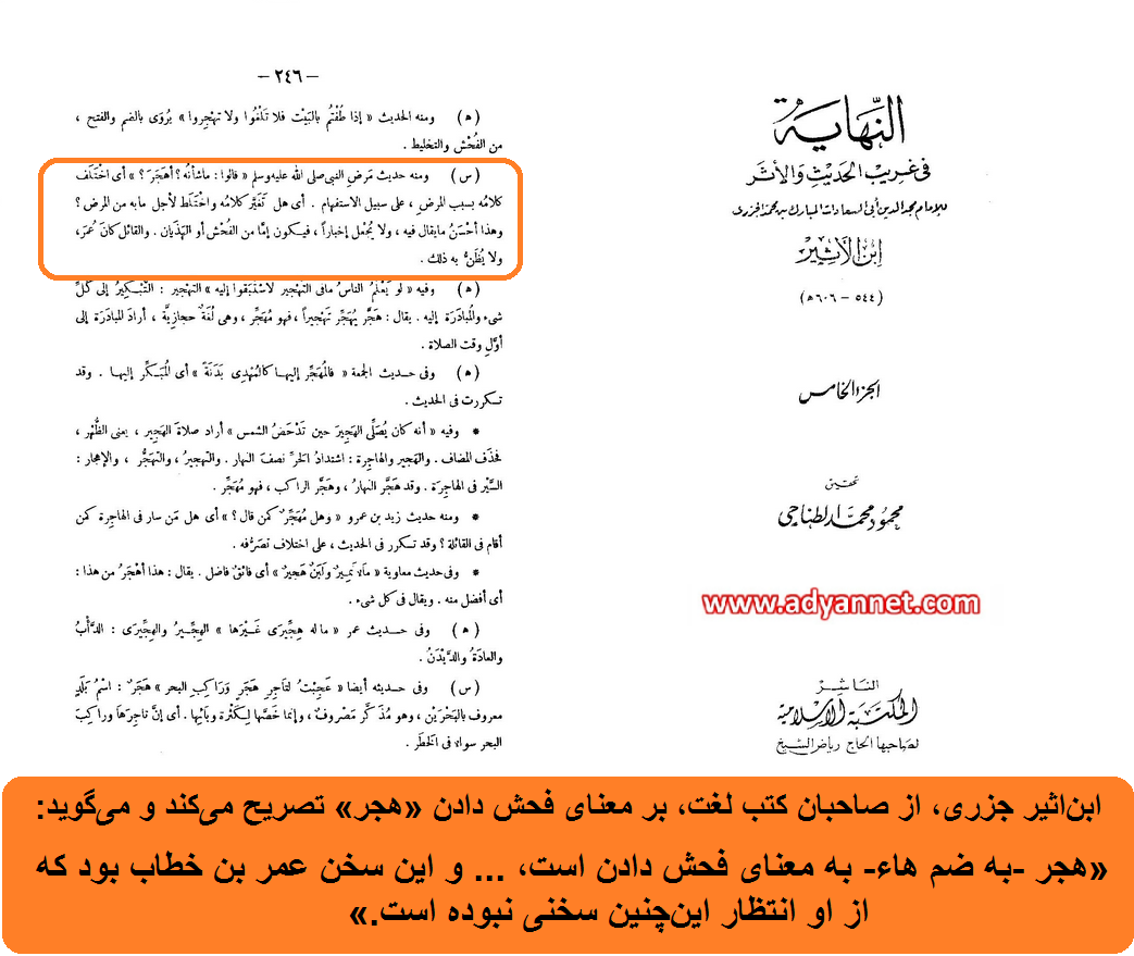 «أهجر فی منطقه یهجر اهجاراً اذا أفحش... و القائل کان عمر بن خطاب و لایظنّ به ذلک.»