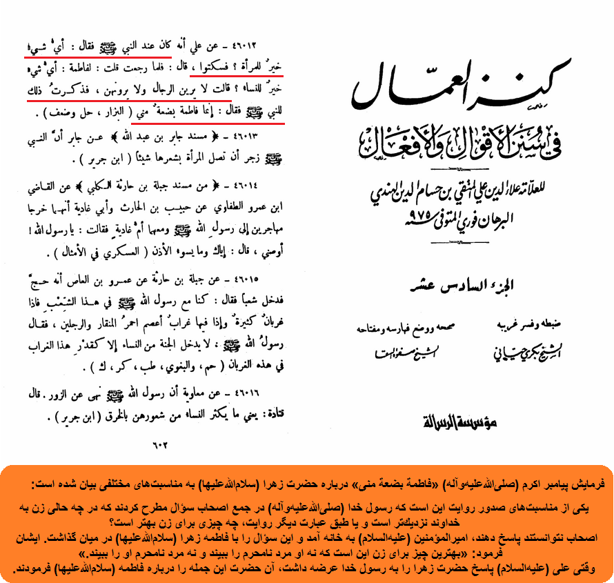 فرمايش پیامبر اکرم صلیاللهعلیهوآله «فاطمة بضعة منی» درباره حضرت زهرا سلاماللهعليها، به مناسبتهای مختلفی بيان شده است؛ يكی از مناسبتهای صدور این روايت اين است كه رسول خدا صلیاللهعلیهوآله در جمع اصحاب سؤال مطرح كردند كه در چه حالی، زن به خداوند نزديكتر است و يا طبق عبارت ديگر، چه چيزی برای زن بهتر است؟!