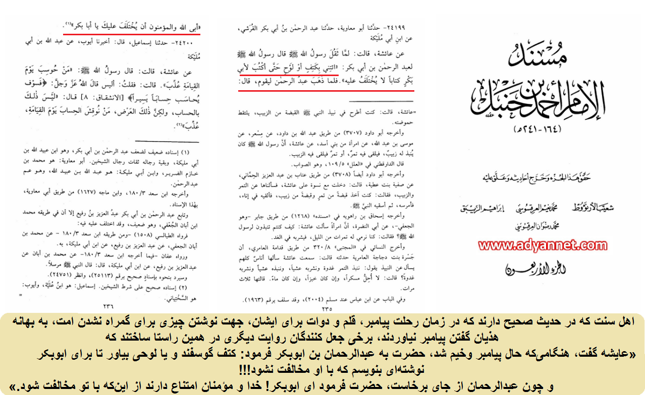 «عن عایشه قالت لمّا نقل رسول الله-ص- قال رسول الله-ص- لعبد الرحمن بن ابی بکر ائتنی بکتف او لوح حتی أکتب لای بکر کتاباً لایختلف علیه فلمّا ذهب عبدالرحمن لیقوم قال ابی الله و المومنون ان یختلف علیک یا ابابکر.»