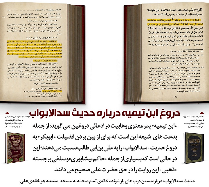 [5]. «قوله ـ سدّ الابواب ـ کلّها الا باب علیّ فانّ هذا ممّا وضعته الشیعه علی طریق المقابله.» منهاج السنه النبویه، ابن تیمیه، موسسه قرطبه، قاهره، مصر، ج 5، ص 35.