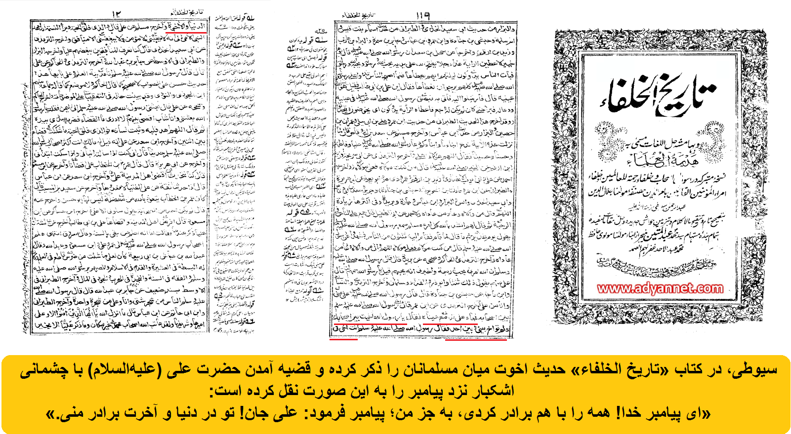 سیوطی، در کتاب «تاریخ الخلفاء» حدیث اخوت میان مسلمانان را ذکر کرده و قضیه آمدن حضرت علی (علیهالسلام) با چشمانی اشکبار نزد پیامبر را به این صورت نقل کرده است: «ای پیامبر خدا! همه را با هم برادر کردی، به جز من؛ پیامبر فرمود: علی جان! تو در دنیا و آخرت برادر منی.»